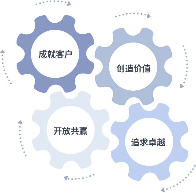 成就客户是一切决策的出发点,创造价值是衡量所有工作的标准,追求卓越是888贵宾会做事做人的态度,开放共赢是888贵宾会的格局也是最终的结果。价值观的齿轮环环相扣,推动着组织里的每个人不断向前。
